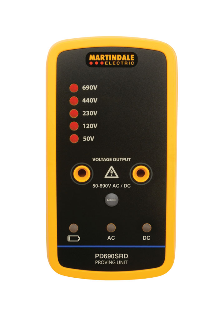 For complete flexibility, the Martindale PD690SRD has both AC / DC outputs selectable by a push button switch and stepped voltage output with LED indication, matched to two pole tester thresholds with a maximum output voltage of 690V. It’s good practice to match the output voltage of the proving unit with the voltage range of the instrument to be proved.