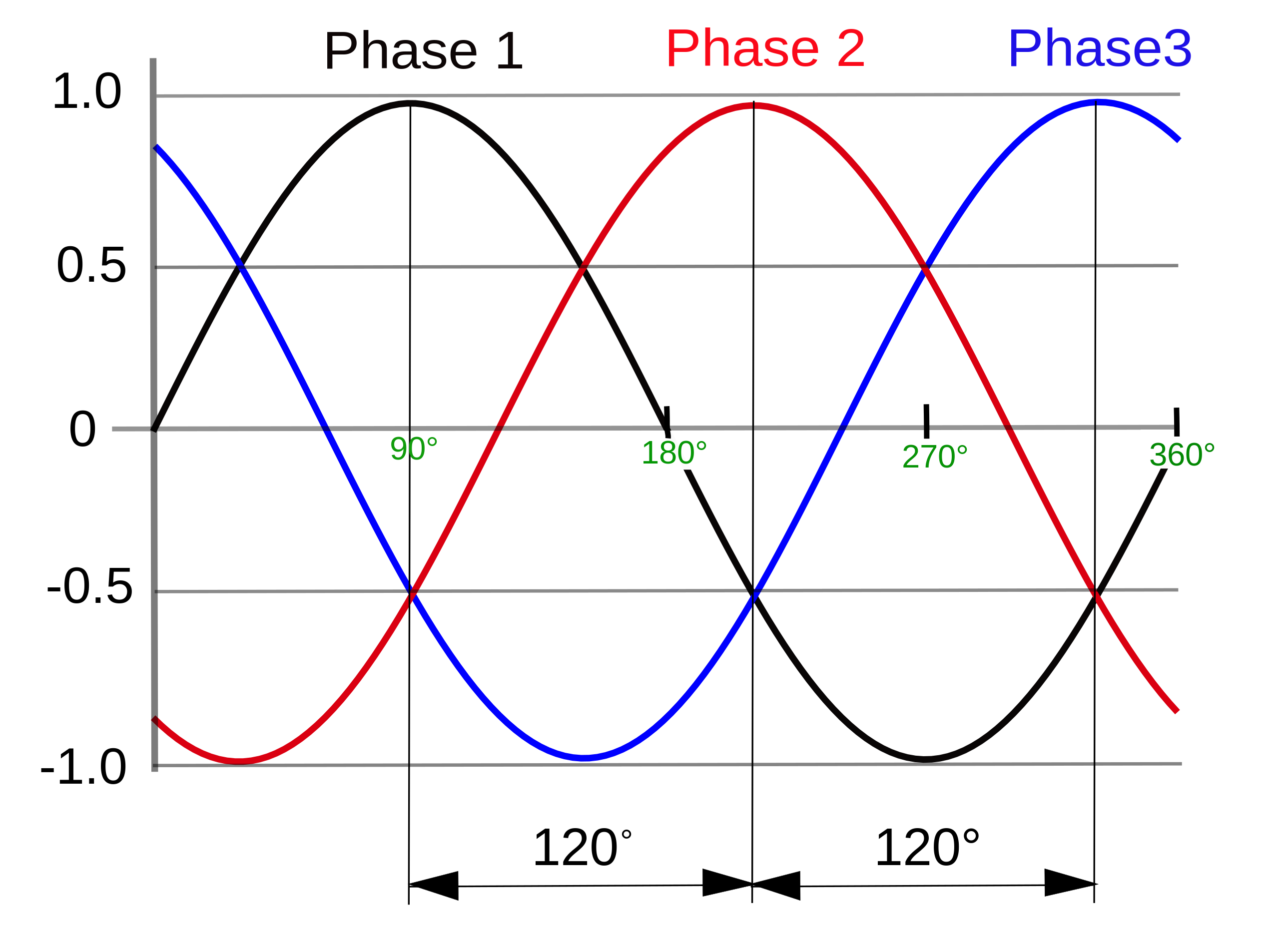 A three-phase system consists of three power wires, arranged to be out of phase with one another by 120 degrees. This means that all three phases of power have entered the cycle by 120 degrees, and all three phases peak at different times during a complete cycle. This creates waveforms with no peaks or drop-offs, resulting in a much smoother and more consistent power supply when compared with single-phase power.