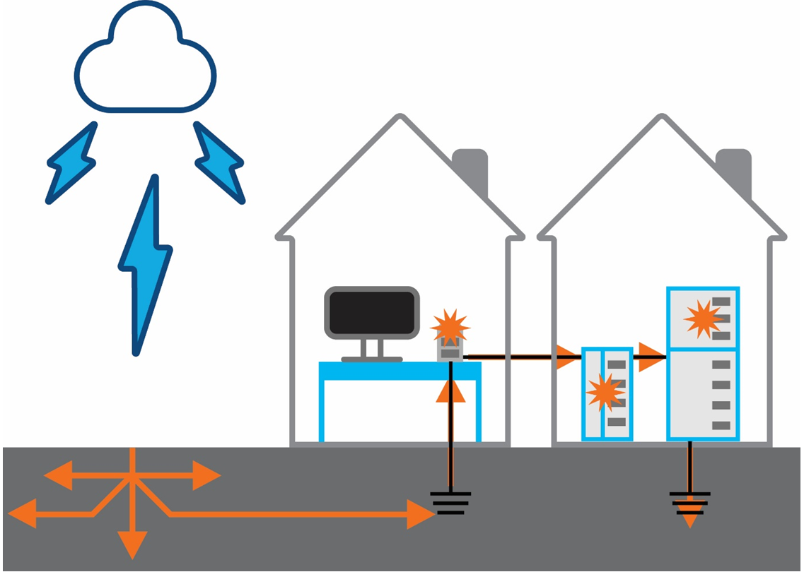 The power cable could even be underground and if the lightning struck somewhere nearby a massive amount of current will be injected into the ground. As the current flows away, a voltage will be induced; this is known as resistive coupling which is the most common cause of indirect atmospheric transient overvoltages. Such transients occur when a lightning strike raises the electrical potential of one or more of a group of electrically interconnected buildings, as illustrated in Fig 2.