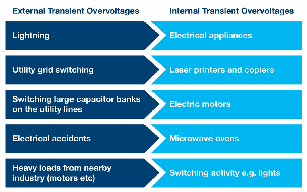 Voltage disturbances in the form of overvoltage can originate from outside of an installation or from within the installation itself. In fact, about 35% of all transients come from outside the facility with the remaining 65% generated inside our homes and facilities – see Table 1 (pictured below) for examples of where such transients may originate from.